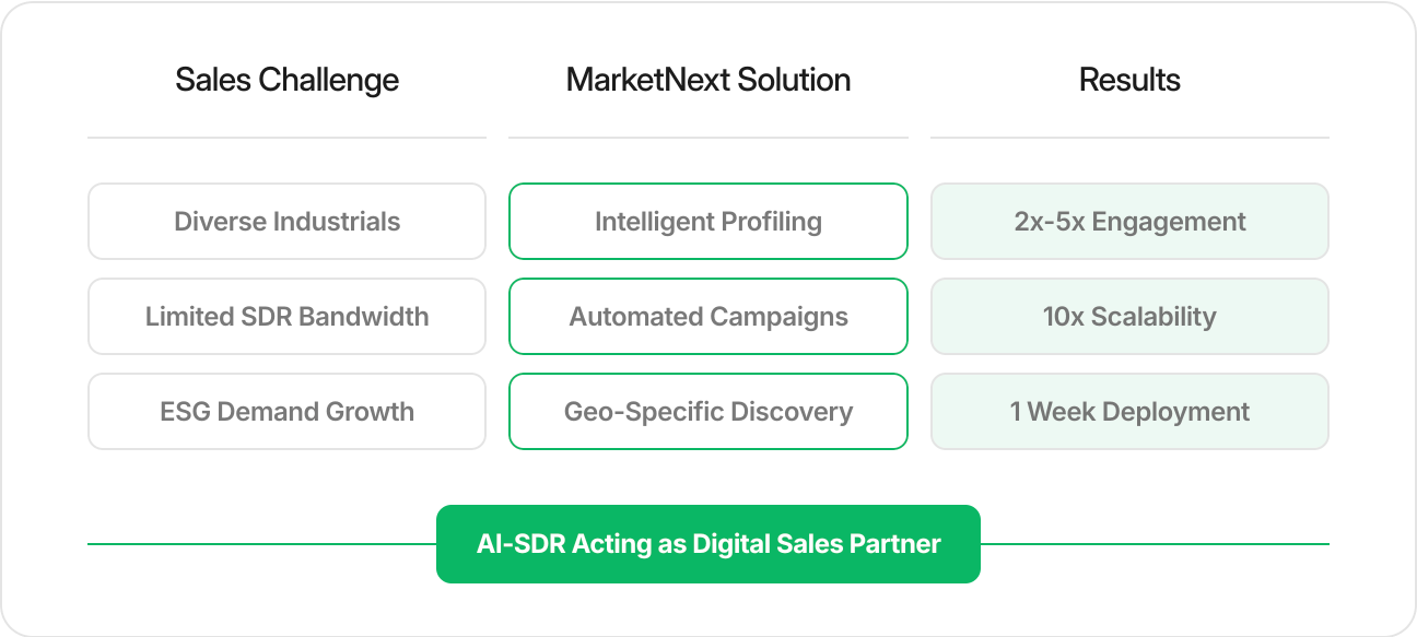 The company now operates with a steady pipeline of ESG-aligned prospects. Sales teams can focus on high-value conversations while AI handles prospecting, profiling, and initial engagement across diverse industrial verticals.